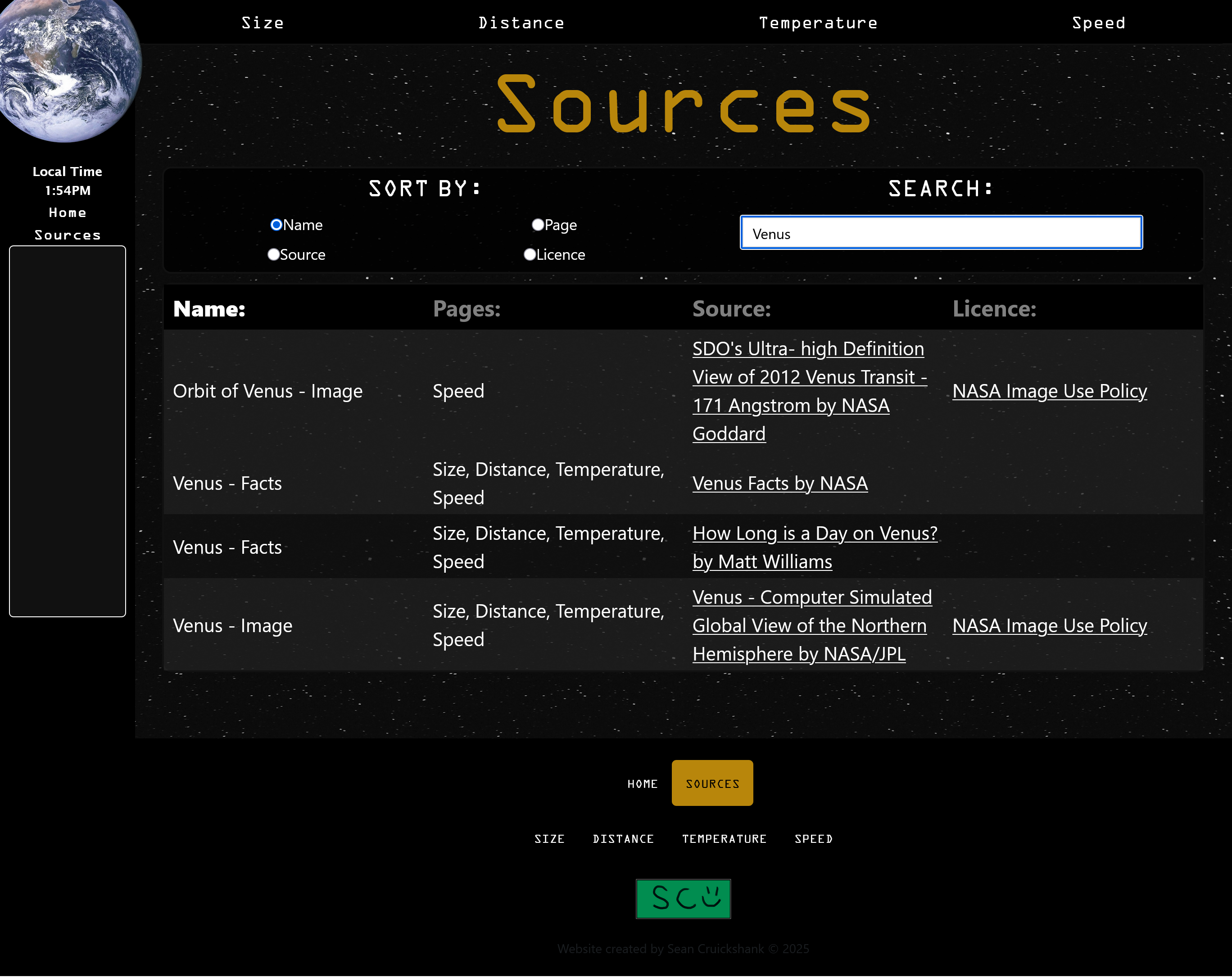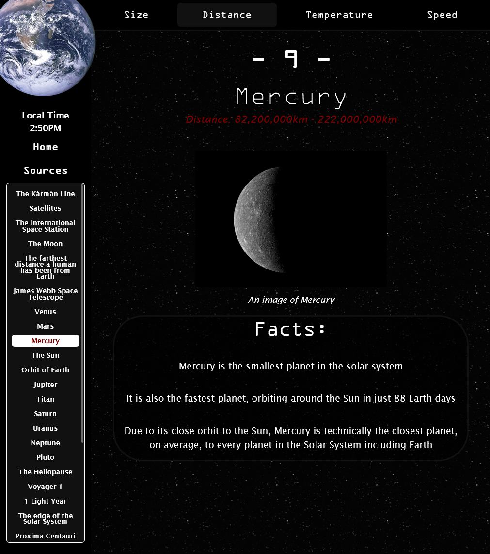 An interactive and educational space facts website. Each page contains a ranking of different space objects, from smallest to largest, based on a specific theme.